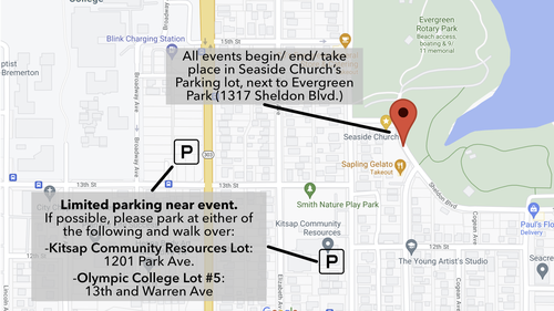 Meet @ Evergreen Park across from the Seaside Church Parking Lot: 1317 Sheldon Blvd. See map below for parking.